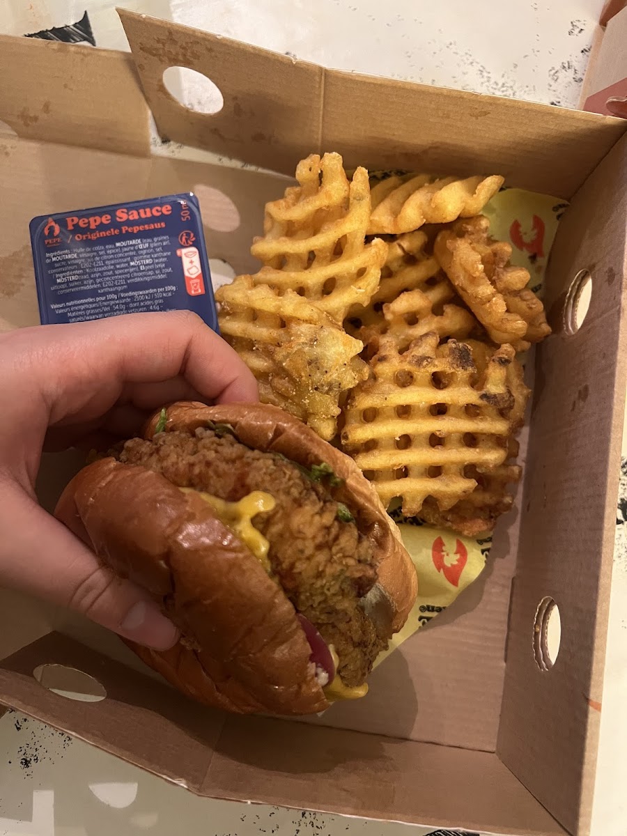Got it via Uber eats, one of the best burgers I’ve ever tasted. Chicken juicy,sauces fantastic. Only in Bordeaux for a few days but going back to get another burger before I leave it was so good.